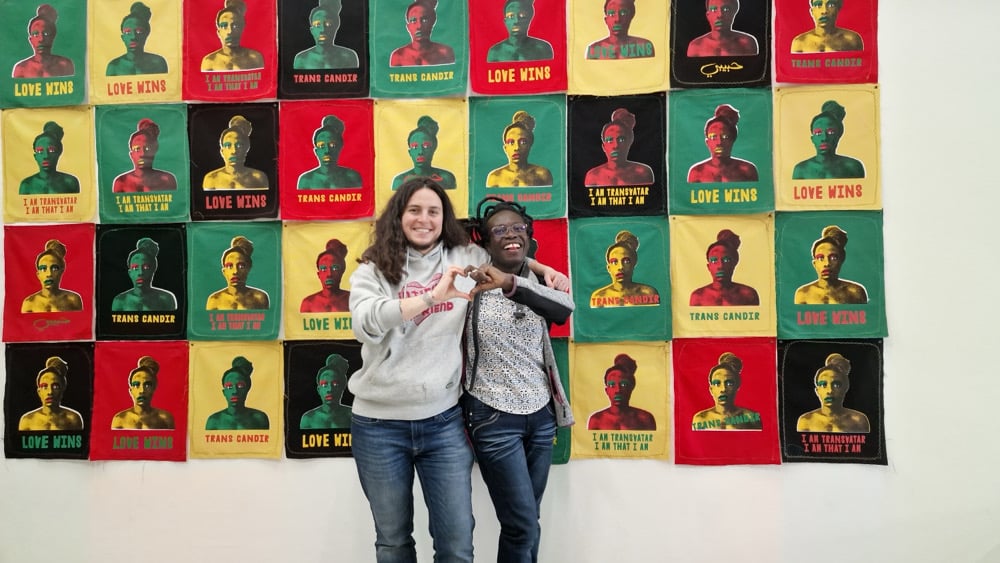For the Activist Choreographies of Care exhibition, Rüzgar Buşki expanded this gesture into a new body of work: 36 monoprinted banners—each one a bold visual response to the 36 pages of the discriminatory bill. Using Va-Bene’s iconic social media tag #LoveWins as a unifying thread, the banners celebrate transnational queer solidarity and highlight the shared struggles across borders—connecting the cities of Istanbul, Berlin, and Kumasi, where both artists are rooted.